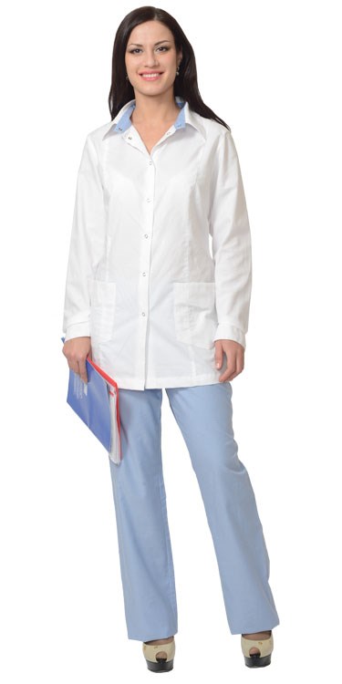 Блуза женская, полуприлегающего силуэта, с центральной застёжкой на кнопки, воротником рубашечного типа и рельефными швами. Изделие с нижними накладными фигурными карманами и разрезами по низу боковых швов. Рукава втачные с манжетами на рубашечных кнопках.