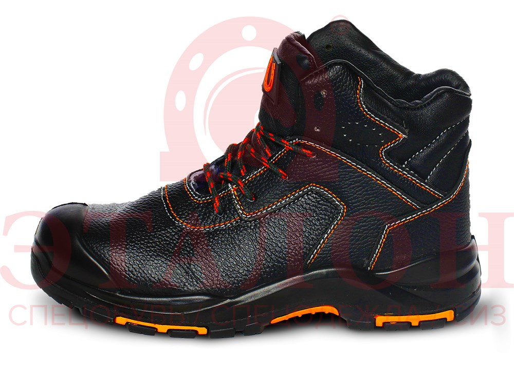 Ботинки изготовлены методом литья к заготовке верха обуви промежуточного слоя подошвы из полиуретана с ходовым слоем из резины на основе нитрильного каучука. Данная модель обеспечивает защиту от нефти, нефтепродуктов, механических воздействий, растворов кислот и щелочей концентрации до 30%, кратковременного (60 с) контакта с поверхностями, нагретыми до температуры 300°С, общих производственных загрязнений, а также для защиты от термических рисков электродуги. Нитки выполнены из негорючих материалов. Верхняя часть обуви выполнена из термоустойчивой и водоотталкивающей кожи (юфти) толщиной от 1,8 до 2,0 мм. Отсутствуют металлические детали (Metalfree). Подошва – двухслойная ПУ-Нитрил. Верхний слой из полиуретана обладает амортизирующими свойствами, гасит ударные нагрузки, а также придает обуви легкость, комфортность и повышенные теплозащитные свойства. Ходовой слой изготовлен из износостойкой, термостойкой (+300°С/ 60 с), морозостойкой резины на основе нитрильного каучука с улучшенным сопротивлением скольжению, стойкостью к деформациям, истиранию. Носочная часть имеет дополнительную защиту в виде полиуретановой накладки, предотвращающей механические повреждения обуви и препятствующей проникновению холода. Для защиты от ударов в носочной части стопы применяется композитный подносок (Мун 200), имеющий конфигурацию, препятствующую надавливанию верхнего края на стопу, и оборудованный прокладкой из полиуретана. Рисунок протектора подошвы обеспечивает хорошую сцепляемость с обледенелыми и замасленными поверхностями (глубина протектора составляет 5,0 мм). Обладает эффектом самоочищения. Объемная колодка специальной конструкции дает возможность работать целый день, не испытывая дискомфорта и усталости.