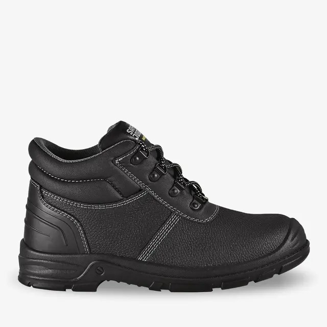 Описание модели: Кожаная черная дышащая обувь, водоотталкивающая, металлический подносок, антипрокольная металлическая стелька, антистатические свойства, нескользящая подошва, подкладка из нейлоновой сетки, дополнительная ПУ защита в области подноска, моделированная стелька, абсорбция удара в области пятки при ходьбе, усиленный ребристый задник для абсорбции удара сзади, клапан глухой противопылевой, надежная шнуровка, для типа ног со стандартным и высоким подъемом, S3, ПУ/ПУ подошва.