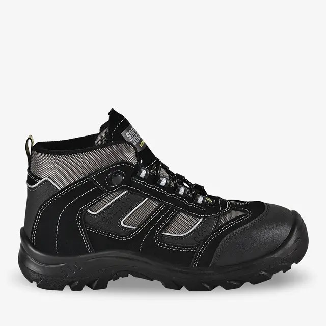 Описание модели: Кожаная (нубук) дышащая обувь, черная, водоотталкивающая, отсутствие металлических элементов, композитный подносок, антипрокольная стелька SJ Flex, антистатические свойства, нескользящая подошва, подкладка из нейлоновой сетки, дополнительная ПУ защита в области подноска, моделированная стелька, абсорбция удара в области пятки при ходьбе, светоотражающие элементы, петля на заднике для удобного одевания, клапан глухой противопылевой, надежная шнуровка, для типа ног со стандартным и высоким подъемом, S3, PU/PU подошва.