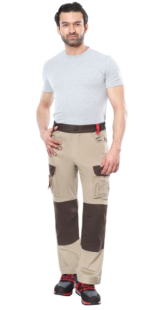 Брюки с застёжкой спереди гульфик с молнией, с поясом, частично стянутым по бокам эластичной лентой и застёгивающимся на 1 пуговицу, с многофункциональными карманами, с наколенниками.