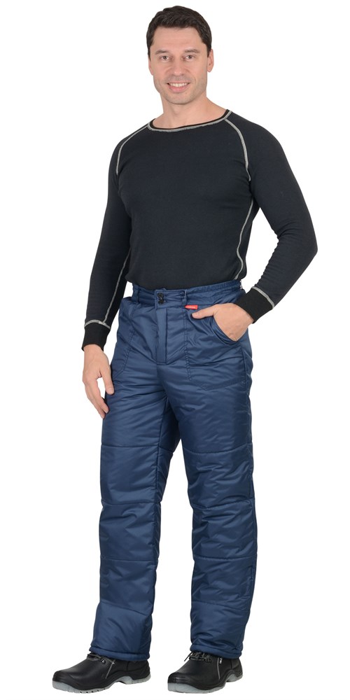 Брюки прямые, утеплённые, с центральной застежкой на тесьму "молния", притачным поясом с эластичной лентой по бокам, с застежкой на две обметанные петли и пуговицы, с пятью шлёвками: две на передней, три на задней части пояса; с боковыми карманами, задним карманом с клапаном на липучке.