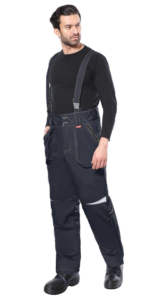 Брюки прямые на утеплённой подкладке, с застежкой спереди на гульфик с молнией. Брюки с фигурным широким поясом с застежкой на 2 пуговицы, с боковыми накладными карманами с молнией, со съёмными бретелями. По боковым швам внизу разрез с молнией. Бретели пристегиваются к брюкам при помощи пуговиц и петель, регулируются по длине защелками-фастексами.