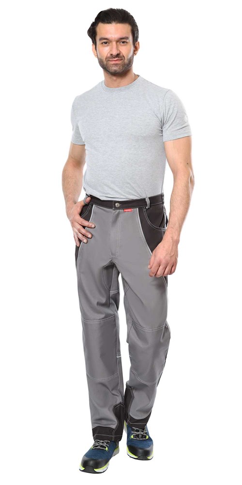 Брюки прямые, изготовлены из ткани "Панакота Комфорт", с застёжкой спереди на молнию, с притачным поясом на пуговице, с внутренними боковыми карманами и наколенниками, с усилительными накладками по шаговому шву и по низу брюк, с накладными задними карманами, с карманом для инструментов. На задних половинках предусмотрен СВ кант для сигнальной видимости.