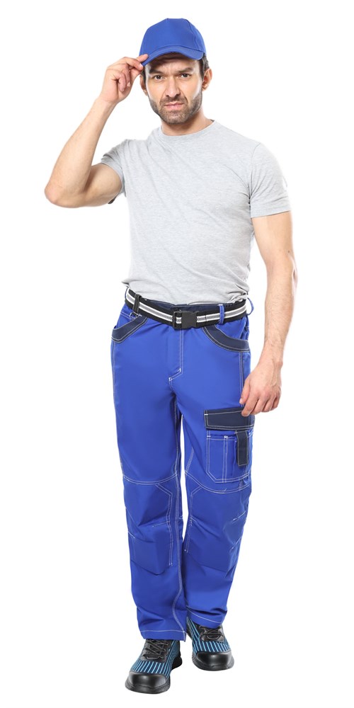 Брюки прямого силуэта и комплектуются съемным ремнем из резинки с застежкой-фастекс. Брюки с застежкой гульфика на молнию. Передние половинки с боковыми внутренними карманами, справа часовой карман и фигурные объемные наколенники. На левом боковом шве передних половинок накладной комбинированный карман с клапаном. Клапан застегивается на липучку. Задние половинки с отрезной кокеткой, с накладными карманами и карманами под инструменты. Притачной пояс брюк с резинкой по боковым сторонам для мягкого прилегания. В брюках предусмотрен кант контрастного цвета.