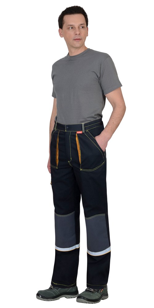 Брюки прямые, на поясе с эластичной лентой по боковым сторонам, с застёжкой на молнию спереди – гульфик, с передними и задними карманами и карманом на правом боковым шве с молнией, с наколенниками. В брюках предусмотрена лента светоотражающая для обозначения сигнальной видимости.