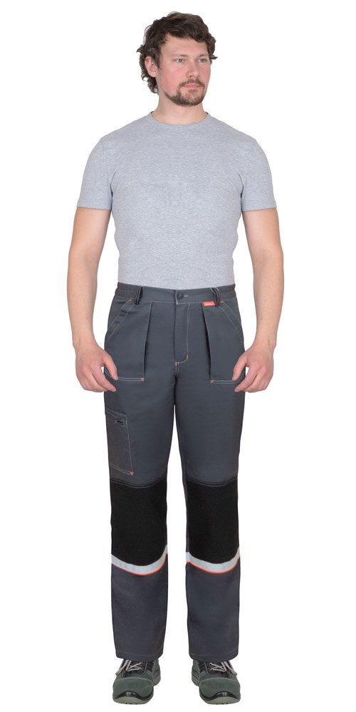 Брюки прямые, на поясе с эластичной лентой по боковым сторонам, с застёжкой на молнию спереди – гульфик, с передними и задними карманами и карманом на правом боковым шве с молнией, с наколенниками. В брюках предусмотрена лента светоотражающая для обозначения сигнальной видимости.