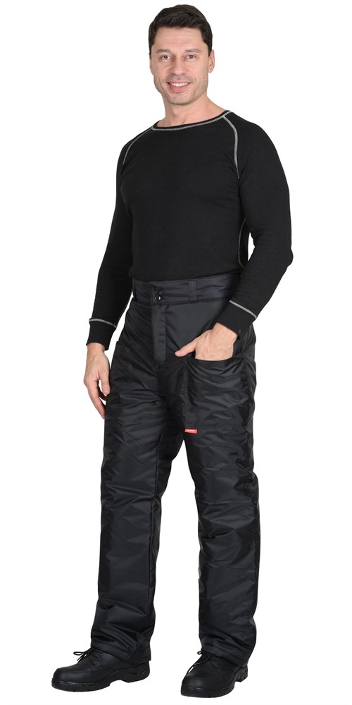Брюки прямые с широким поясом, с застежкой на две обметанные петли и пуговицы, пятью шлёвками: две на передней, и три на задней части пояса, с центральной застежкой гульфика на тесьму - «молния» и ветрозащитным клапаном, двумя накладными карманами.