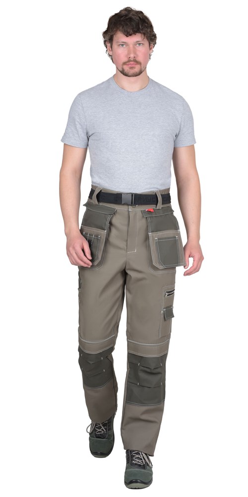 Брюки выполнены из ткани "Канвас Комфорт", прямого силуэта, с притачным поясом, с застежкой гульфика на тесьму – «молния», с различными многофункциональными карманами и объёмными наколенниками. В брюках предусмотрен ремень из резинки ременной «Сириус» застегивающийся на защелку-фастекс.