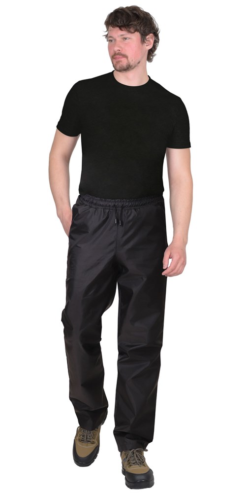Брюки прямого силуэта, из полиэфирной водоотталкивающей ткани, без застёжки, с поясом, стянутым по всему объёму на резинку и со шнуром для регулировки ширины брюк по талии, с боковыми внутренними карманами с наклонным входом.