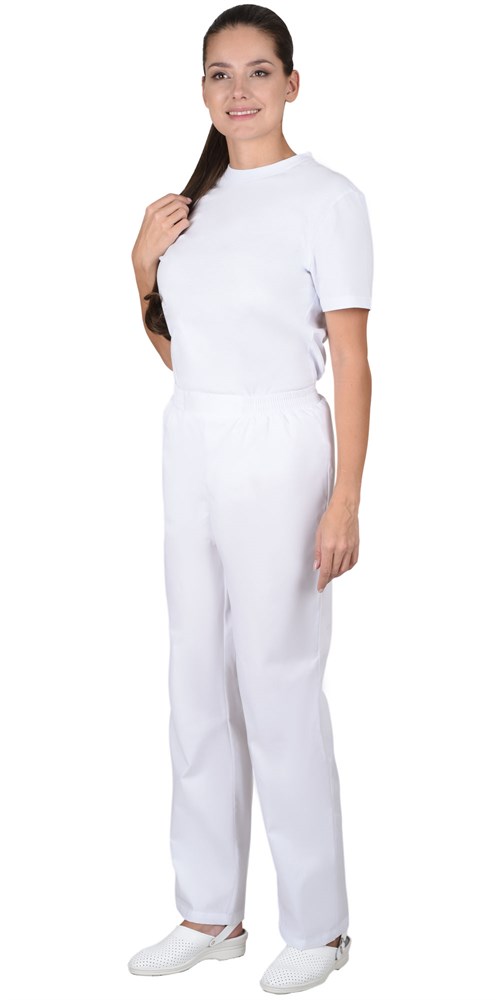 Брюки прямые на притачном поясе, частично стянутом на эластичную тесьму, спереди на поясе вставка.