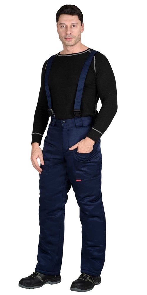 Брюки прямые, с накладными карманами, на притачной утеплённой подкладке, с застёжкой гульфика на молнию. Брюки с широким притачным поясом с застежкой на петли и пуговицы, с бретелями. Бретели съемные, пристегиваются к брюкам при помощи пуговиц и петель, регулируются защелками-фастексами.