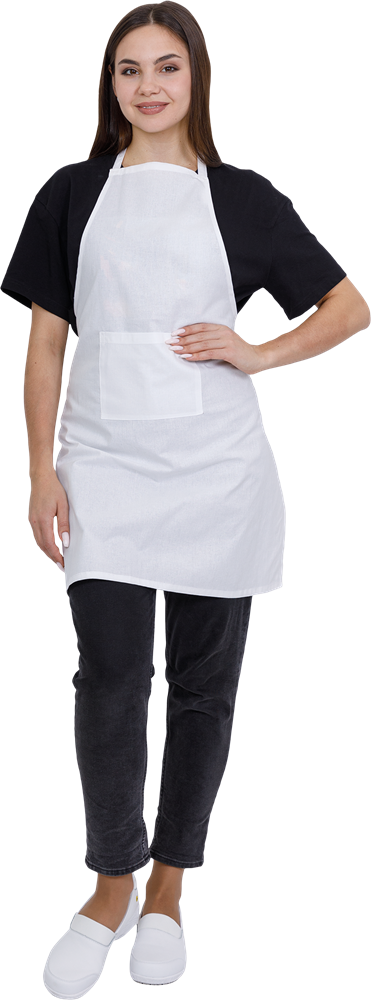 Фартук из хлопка с накладным карманом. Изделие с цельнокроеным нагрудником и притачанной к боковым углам на уровне талии тесьмой для завязывания. Фартук бело цвета предназначен для пищевой промышленности.