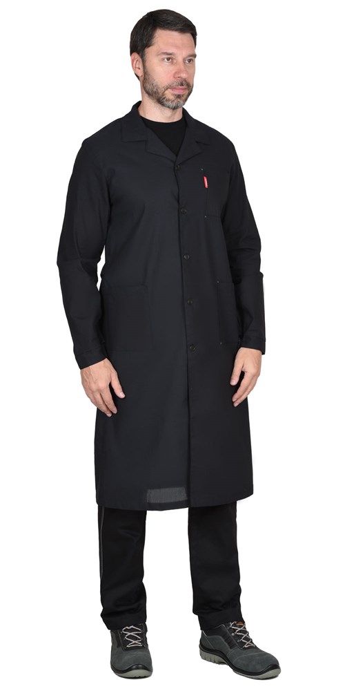 Тк. бязь, 100% х/б. Отложн. воротник, застёжка на пуговицы, два кармана. Манжеты рукавов на пуговице. По талии спинки - хлястик. ГОСТ 12.4132-83.
