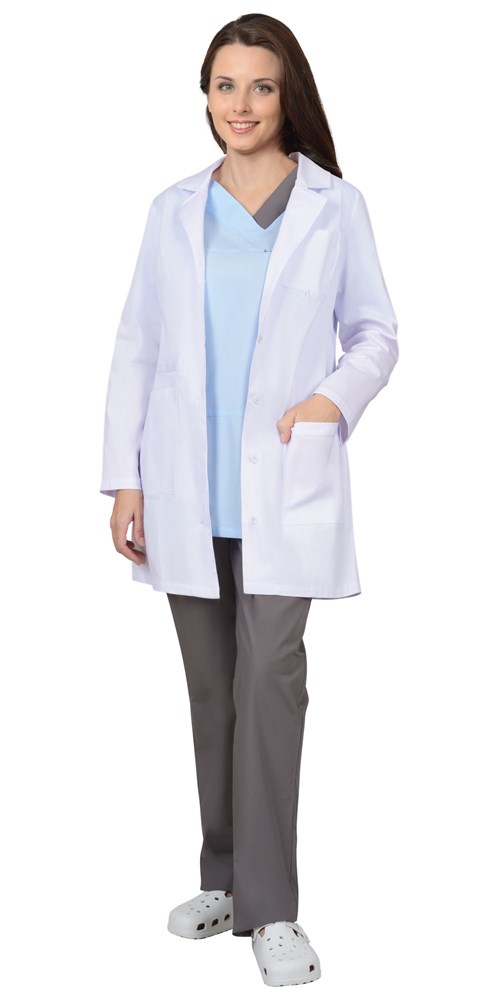 Халат женский полуприлегающего силуэта с центральной бортовой застёжкой на петли и пуговицы. Отложной воротник с лацканами. Один нагрудный и два нижних накладных кармана. Рукава втачные длинные.