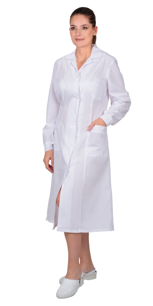 Классическая модель с нагрудным и двумя нижними накладными карманами, отложным воротником и длинными рукавами с манжетами. Ширина халата по линии талии регулируется хлястиком.