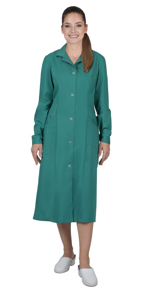 Классическая модель с нагрудным и двумя нижними накладными карманами, отложным воротником и длинными рукавами с манжетами. Ширина халата по линии талии регулируется хлястиком.