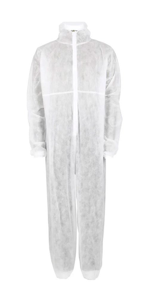 Одноразовый комбинезон белого цвета изготовлен из гипоаллергенного нетканого материала спанбонд плотностью 40гр/м.кв.