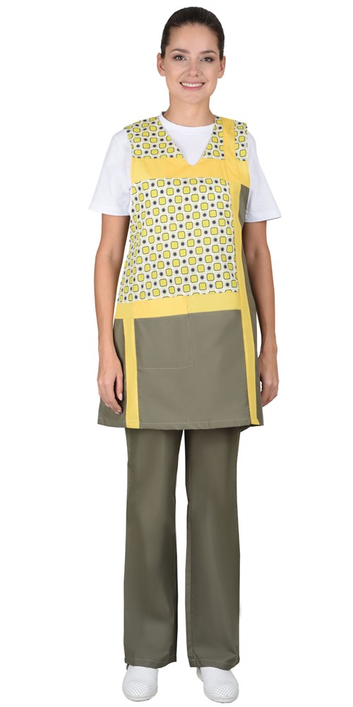 Комплект женский комбинированный , трехцветный, состоит из фартука-сарафана и брюк. Фартук-сарафан с V-образным вырезом горловины и прямой линией низа, с боковыми завязками на полочке и резинкой и пуговицей на спинке для регулировки объема по талии, с накладным карманом на правой половинке полочки. Брюки прямые, без застежки, с притачным поясом, частично стянутым резинкой и с накладными боковыми карманами.