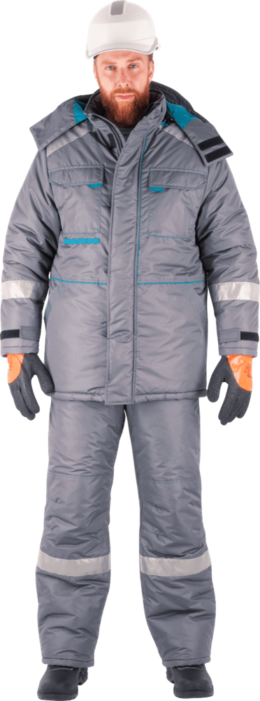 В костюме используются световозвращающая полоса (СОП) и кант бирюзового цвета.