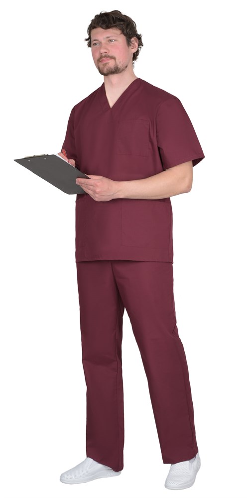 Костюм состоит из блузы и брюк. Блуза прямого покроя с V-образным вырезом горловины. На полочке один верхний и два нижних накладных кармана. Рукава короткие. Брюки прямого покроя на резинке.