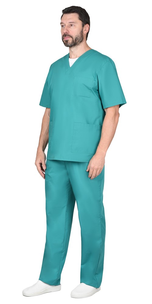 Костюм состоит из блузы и брюк. Блуза прямого покроя с V-образным вырезом горловины. На полочке один верхний и два нижних накладных кармана. Рукава короткие. Брюки прямого покроя на резинке.