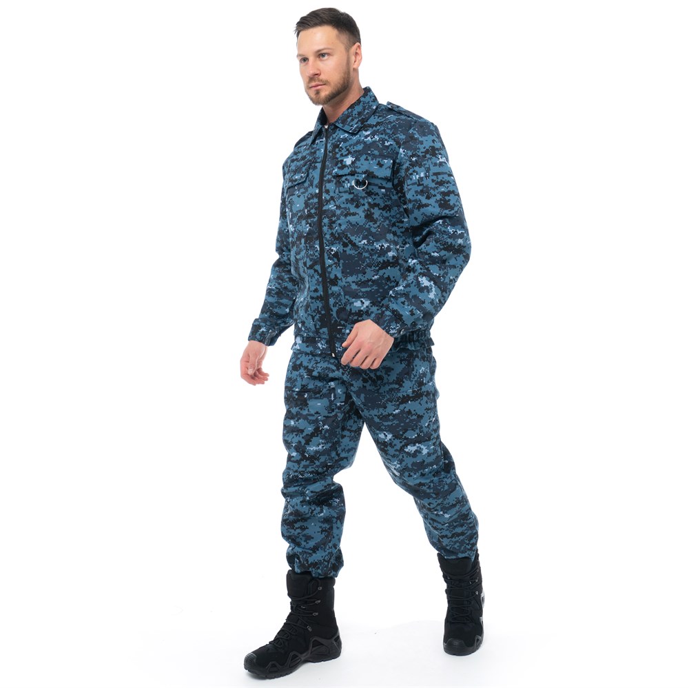 Костюм "ОХРАННИК" КМФ цифра выполнен в соответствии с ГОСТ и включает в себя 2 предмета: куртка/брюки. Куртка застегивается на молнию. На изделии расположены карман полочки, разделенный на верхние карманы с клапанами на липучку и нижние карманы с вертикальным входом. На рукавах манжеты на пуговицах по низу для фиксации посадки. Модель куртки представлена в укороченном варианте на поясе с частичной стяжкой на эластичную резинку. На модели фигурные погоны на пуговицах по плечевым швам. На брюках расположены накладные карманы с косым входом. На изделии есть держатель- полукольцл с левой стороны для крепления бейджа. Гульфик застегивается на пуговицы. На брюках пояс притачной на пуговицу с частичной стяжкой на эластичную резинку.