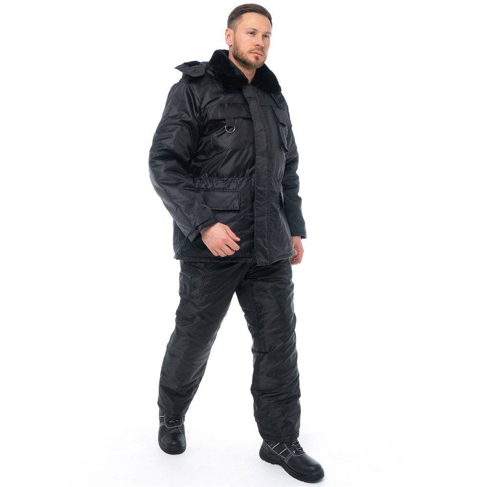 Костюм утепленный "ОХРАННИК" черный изготовлен в соответствии с ГОСТ и включает в себя 2 предмета: куртка/брюки. Модель куртки удлиненная, прямого силуэта. Ветрозащитная планка с застежкой на контакт-ленту предотвращает попадание ветра сквозь молнию. На изделии расположены нагрудный карман под рацию, карман с полукольцом под бейдж и нижние накладные карманы с клапанами на ленте-контакт. Плечевые швы оформлены декоративными погонами. Куртка оснащена меховым воротником, утепленным съемный капюшоном. На полукомбинезоне расположены накладные карманы с клапанами на липучках на боковых швах. Эластичная резинка по талии спинки фиксирует посадку. Костюм утепленный "ОХРАННИК" черного цвета - это надежная и комфортная защита от холода и ветра во время работы на улице. Этот костюм идеально подходит для охранников, строителей, рабочих и др. профессионалов. Костюм "ОХРАННИК" выполнен из прочного материала (ткань Оксфорд), который обеспечивает защиту от ветра, дождя и снега. Он также имеет утеплитель (Синтепон), который сохраняет тепло внутри костюма и обеспечивает комфорт в холодные дни.