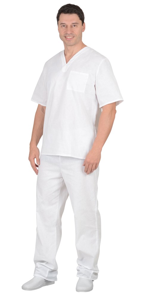 Костюм состоит из блузы и брюк. Блуза с V-образным вырезом горловины, с левым нагрудным карманом. Брюки с резинкой в поясе.
