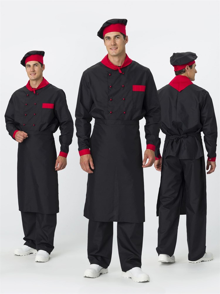 Костюм для повара «Су-Шеф» состоит из 5 предметов: китель повара, брюки, поварской колпак, фартук для повара, платок нашейный. Костюм поварской выполнен в стильном черном цвете с декоративной отделкой красными элементами. Плотная ткань с водоотталкивающей пропиткой обеспечивает костюму длительный срок службы, отлично отстирывается от загрязнений. Китель для повара с длинными рукавами оснащен двубортной застежкой на пукли и воротником с U-образным вырезом. Нагрудный карман подходит для хранения записей. Прямые брюки с поясом на резинке отлично сидят по фигуре и идеально дополняют китель. Колпак повара универсален: высота тульи 10 см, общая высота – 28 см. Регулируется по объему головы с помощью завязок на затылке. Фартук поварской без грудки завязывается на талии. Треугольный платок на шею 34*68 см выступает стильным элементом рабочей одежды.