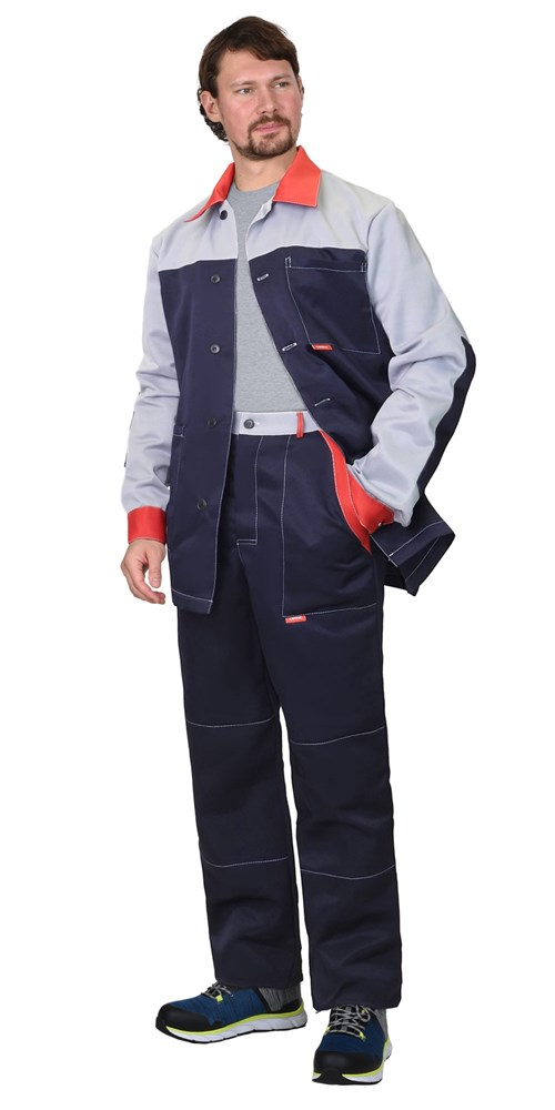 Костюм СИРИУС-АСПЕКТ куртка длинная, брюки, темно-синий со светло-серым с красной отделкой