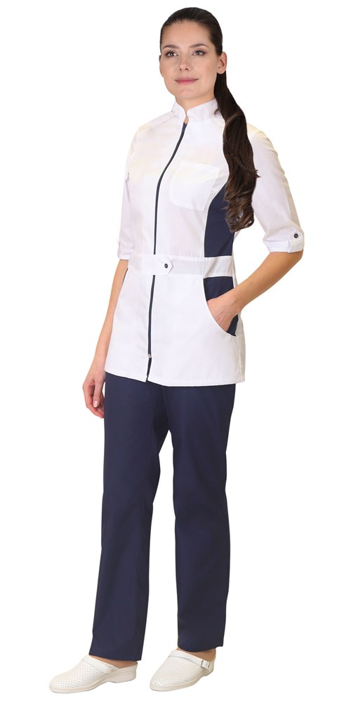 Классическая комбинация белого и синего цветов создают нежный и элегантный визуальный эффект. Костюм идеально подойдет для работников медицинской и бьюти сфер.