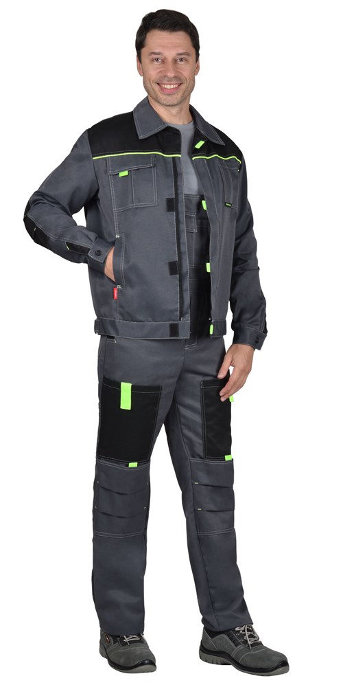 Костюм состоит из куртки и полукомбинезона. Куртка, укороченная с центральной потайной застежкой на молнию, застежкой борта и пояса на липучку. Верхние карманы с клапанами и хлястиком, застегивающимися на липучку. Боковые карманы в вертикальных швах. Пояс регулируется хлястиком на липучке. Воротник отложной. Вертикальные складки спинки увеличивают свободу движения. Контрастная отстрочка швов придает костюму оригинальность. Полукомбинезон, комбинированный с усиленными накладками в области колен, объем по линии талии регулируется тесьмой.Рекомендуется для рабочих специальностей. Современная практичная в эксплуатации и очень экономичная модель летней спецодежды. ГОСТ 12.4.280-2014