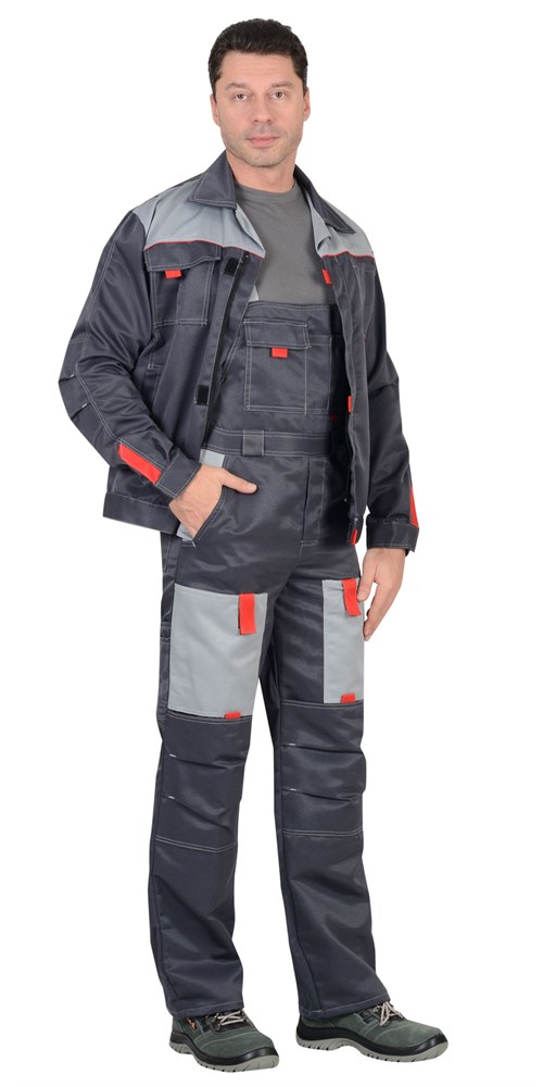 Полукомбинезон прямого силуэта, с застёжкой на молнию: спереди на гульфик и в правом боковом шве, с боковыми карманами на передних половинках, с задним карманом и с двойными накладными карманами для инструментов на правой задней половинке, с усиленными накладками в области колен. По спинке полукомбинезона резинка для лучшего прилегания. Полукомбинезон с бретелями, длина регулируется резинкой и застежкой-фастексом.