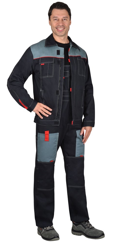 Полукомбинезон с центральной застёжкой гульфика на молнию; с застёжкой на тесьму – «молния» в правом боковом шве; с различными многофункциональными карманами; с объёмными наколенниками; с бретелями, регулируемыми по длине резинкой; со шлевками и резинкой ткацкой по спинке полукомбинезона. ГОСТ 12.4.280-2014