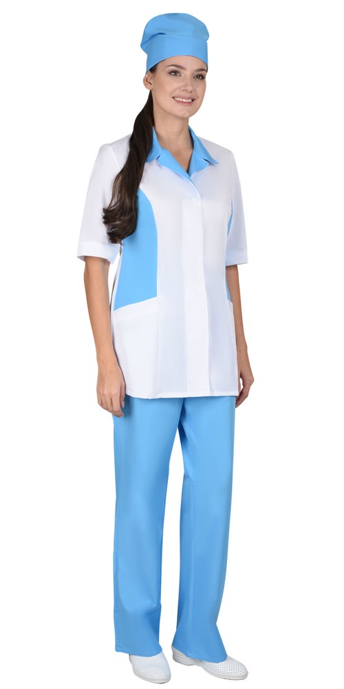 Костюм состоит из блузы, брюк и колпака. Блуза с центральной супатной застежкой на пуговицы. Боковые детали полочек, воротник и колпак из отделочной ткани. Рукава короткие. Брюки прямого покроя на резинке. Колпак с фигурной отделкой.