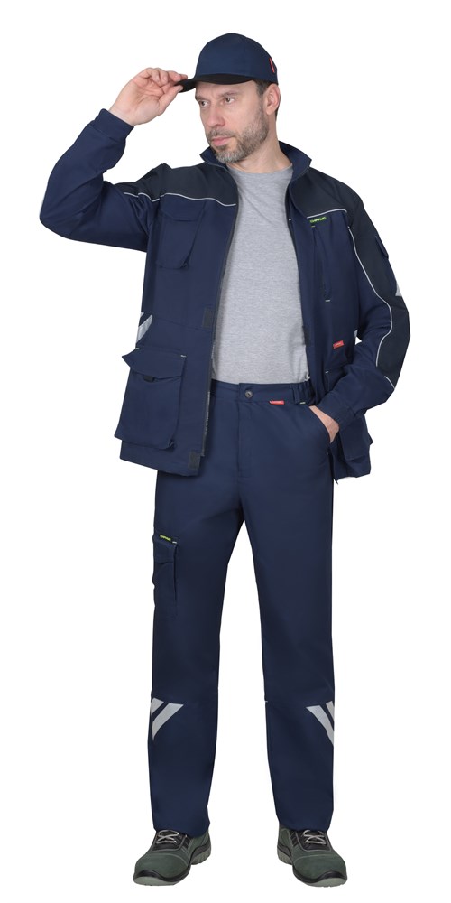 Брюки с притачным поясом с эластичной лентой по боковым швам, застегивающимся на пуговицу, со шлевками, с застежкой гульфика на молнию, с различными функциональными карманами, с элементами из СВ канта и СОП, обеспечивающие безопасность работы в условиях пониженной видимости. ГОСТ 27575-87