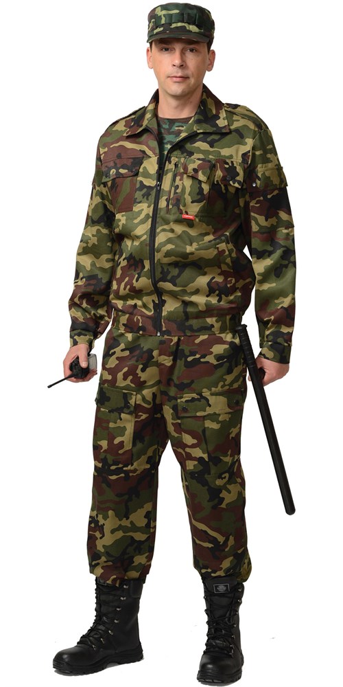 Куртка прямая, укороченная, с застежкой на молнию, с поясом по низу, частично стянутым резинкой. На полочке верхние и нижние карманы; рукава с манжетой, застегивающейся на кнопку. На плечах погоны. Брюки прямые с застежкой на молнию и пуговицу, верхние карманы с наклонным входом, нижние накладные объемные карманы с клапанами, застегивающимися на кнопки, на задней половинке прорезной карман. Тк. смесовая с ВО пропиткой, пл. 220 г/кв.м ТУ 8550-001-81391241-2008.