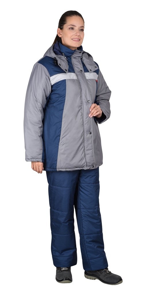 Куртка женская, прямого силуэта, с притачной утеплённой подкладкой, с центральной бортовой застёжкой на двух замковую тракторную тесьму "молния" и внешним ветрозащитным клапаном с 5-ю кнопками, с воротником "стойка" и съёмным утеплённым капюшоном; с боковыми карманами в рельефных швах.
