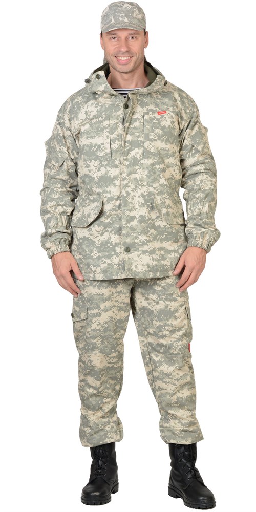 Куртка прямого силуэта, с центральной супатной застежкой на пуговицы, нижняя петля сквозная, с верхними карманами листочка на «молнию», с нижними карманами «листочка» с настрочными концами и фигурным клапанами на пуговицу, с внутренним карманом на «молнию». Рукава с полу объемными накладными карманами и фигурными клапанами на «липучку», с притачной нижней деталью на резинке, с налокотниками. Капюшон с козырьком, кулисами для регулировки, застежкой на пуговицы. По талии и низу куртки регулирует шляпной резинкой и фиксатором.