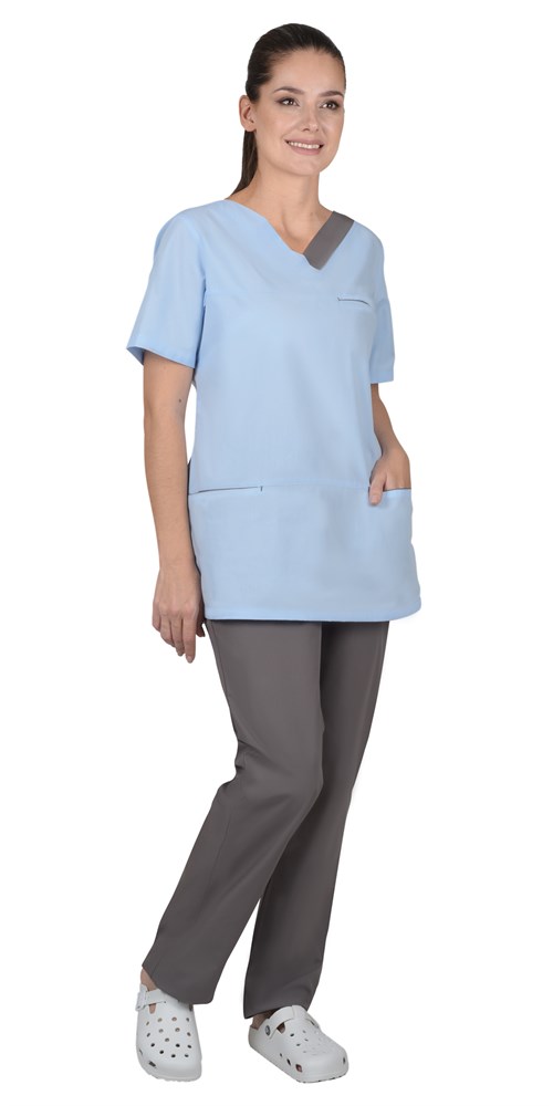 Костюм комбинированный из ткани двух цветов состоит из блузы голубого цвета и брюк темно-серого цвета.