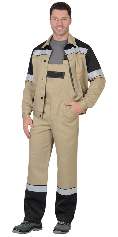 Куртка укороченная ; с центральной застежкой на пуговицы, с налокотниками , с поясом на резинке с накладными карманами и светоотражающей лентой 50 мм.Полукомбинезон с застежкой гульфика на тесьму "молния", с боковой застежкой на пуговицы, с накладными карманами, с наколенниками и светоотражающей лентой 50 мм.