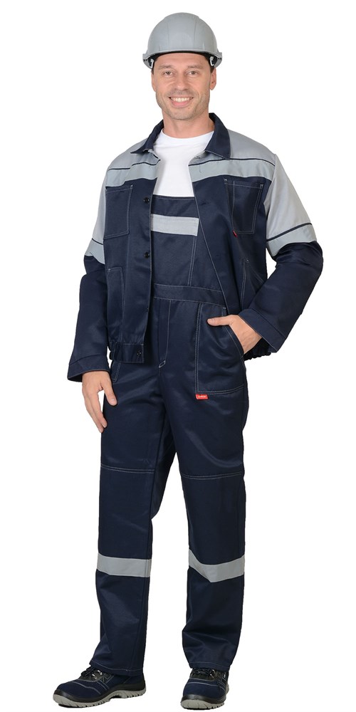 Куртка укороченная, с центральной застежкой на пуговицы, налокотниками, поясом на резинке с накладными карманами и светоотражающей лентой 50 мм. Полукомбинезон с застежкой гульфика на тесьму "молния", с боковой застежкой на пуговицы, накладными карманами, с наколенниками и светоотражающей лентой 50 мм.