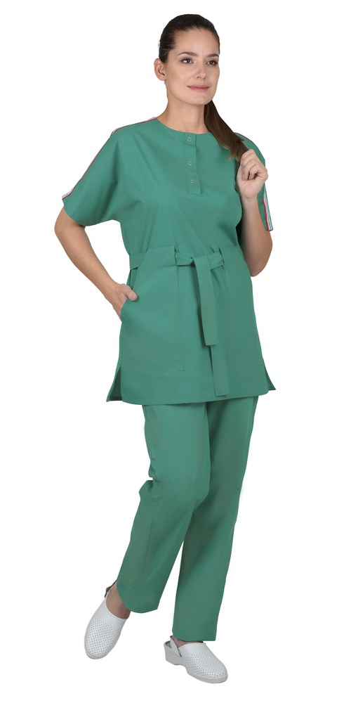 Костюм состоит из блузы и брюк. Блуза полуприлегающего силуэта, с цельнокроеными короткими рукавами, без воротника, с нижними накладными карманами. На блузе центральная застёжка - укороченная планка с кнопками, по плечевым швам настрочена декоративная тесьма. Блуза с завязывающимся впереди поясом, понизу боковых швов блузы разрезы. Брюки прямые на притачном поясе, стянутом на эластичную тесьму, впереди на поясе отрезная деталь, участок без резинки. Задние половинки длиннее передних на 2,5см. Внизу по боковым швам брюк разрезы.