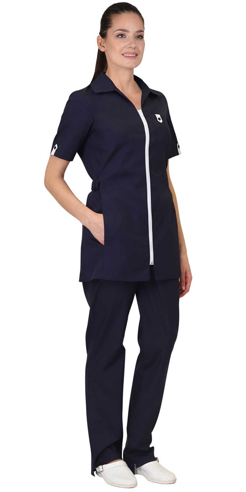 Костюм женский состоит из блузы и брюк темно-синего цвета.