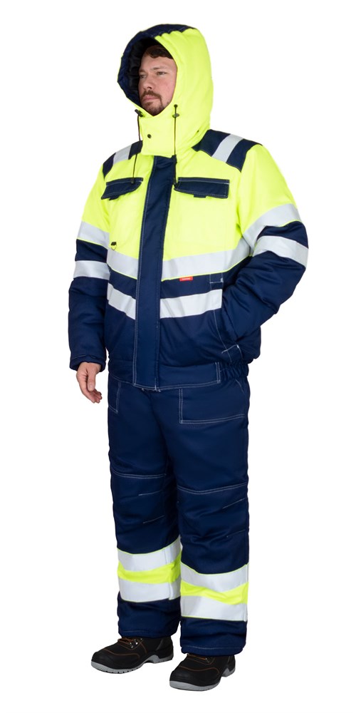 Полукомбинезон прямой, с утеплённой подкладкой, с регулируемыми по длине бретелями, с центральной застёжкой на 2-х замковую молнию, с двумя нагрудными карманами и боковыми карманами спереди, с резинкой по линии талии спинки для лучшего прилегания. Для обозначения сигнальной видимости в полукомбинезоне предусмотрена светоотражающая полоса на вставке контрастного цвета.