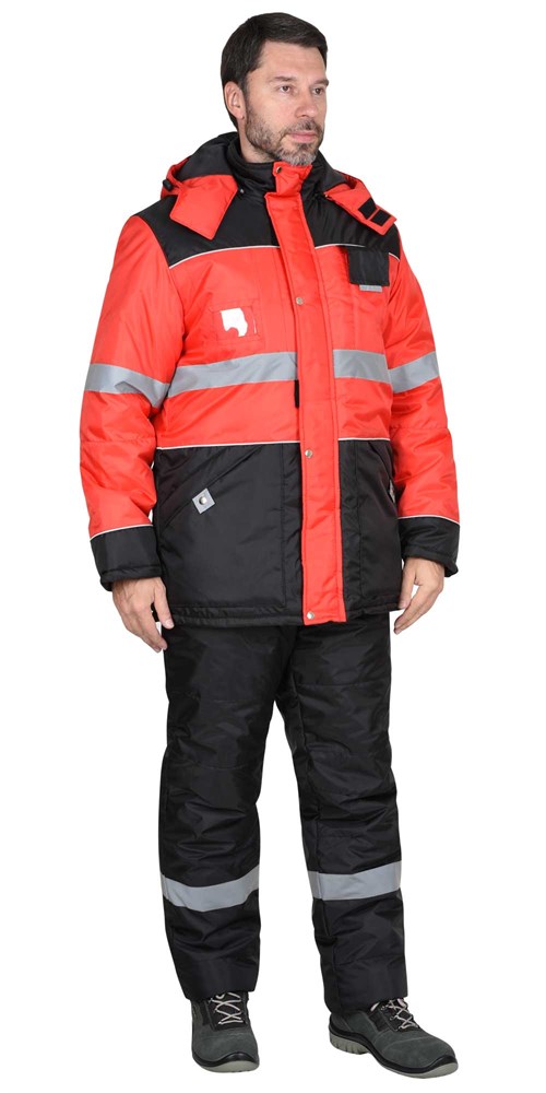 Куртка прямого силуэта, удлинённая, утеплённая, с воротником стойка (внутренний воротник из флиса) и съёмным утеплённым капюшоном, куртка застёгивается на 2-х замковую молнию, закрытую ветрозащитной планкой, застёгивающейся на кнопки и липучку, рукава с внутренней трикотажной манжетой, подкладка куртки с внутренней ветрозащитной юбкой и внутренним карманом на молнии. Куртка с верхними и нижними карманами. Верхний правый карман с молнией и с окном для бейджа, левый карман для рации. Нижние карманы накладные с клапаном на кнопке. Для обеспечения сигнальной видимости в тёмное время суток в куртке предусмотрены светоотражающая полоса (СОП), светоотражающий кант и светоотражающие элементы на карманах.