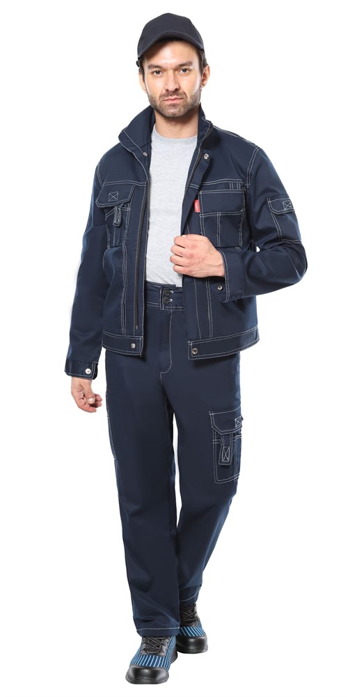Костюм летний состоит из куртки и брюк, швы костюма усилены двойной отделочной строчкой контрастного цвета.