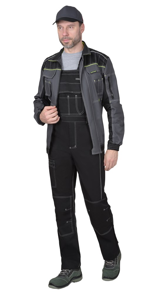 Полукомбинезон прямого силуэта, застежкой гульфика на молния, с различными многофункциональными карманами, с застежкой в правом боковом шве на пуговицы, с наколенниками, с бретелями регулируемыми эластичной тесьмой и фастексами, с эластичной тесьмой по линии талии, на передних половинках в рельеф вшивается СВ кант.