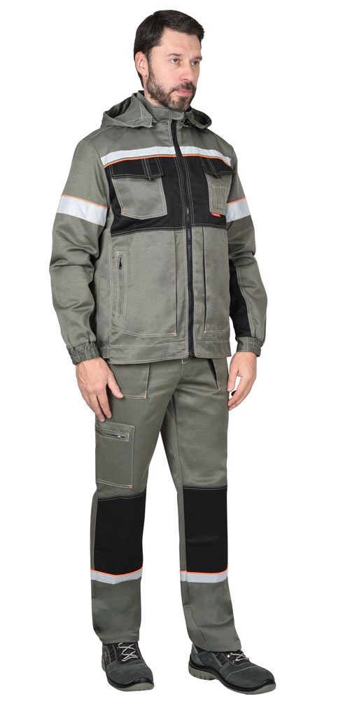 Куртка прямого силуэта, укороченная, с удлиненной фигурной спинкой, с центральной застёжкой на тесьму - «молния» однозамковую до верха, с подпланкой, воротником стойка, с пристёгивающимся капюшоном на молнию и верхними и нижними карманами. Ширина куртки по низу регулируется хлястиком на липучке. Изделие с втачными рукавами и притачной манжетой с частичной стяжкой на резинку ткацкую. В куртке предусмотрен кант контрастного цвета и ленты светоотражающей СОП (мелкодисперсной белой) ш.25 мм и 50 мм для обозначения сигнальной видимости.